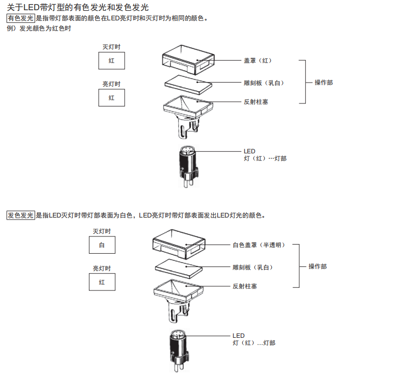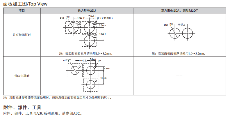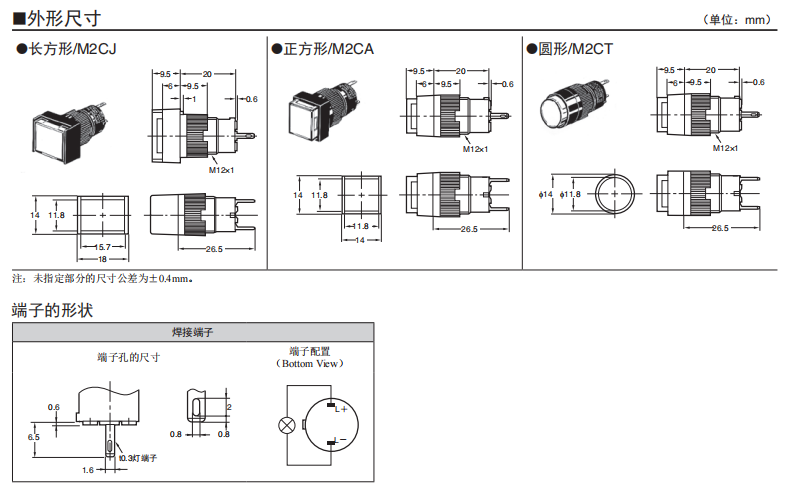 長20mm、 圓型f12系列 ●與按鈕開關A3C系列是同一類型。 ●高亮度的均一表面發光。 ●圓形便于開孔。